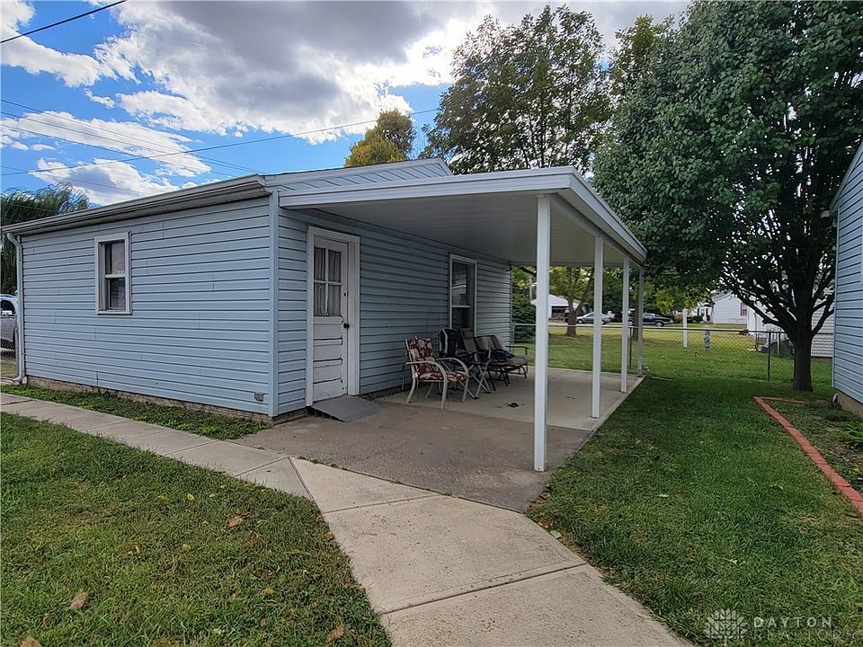 Concrete driveway-carpet/flooring & roof, fenced in backyard.