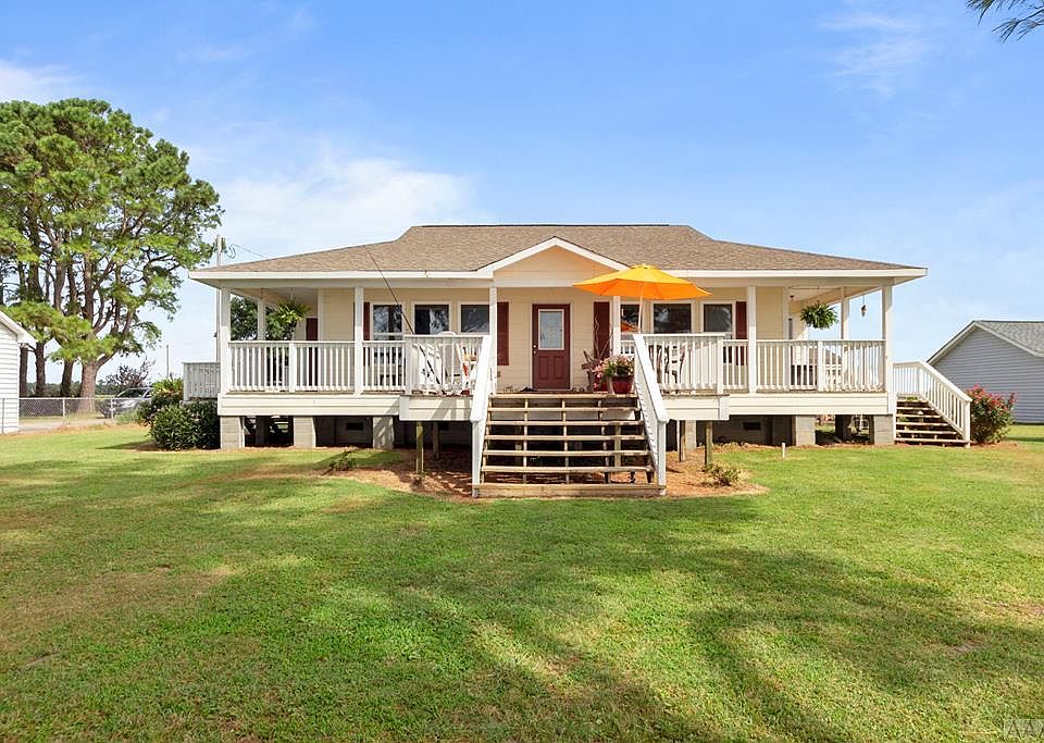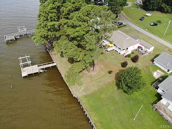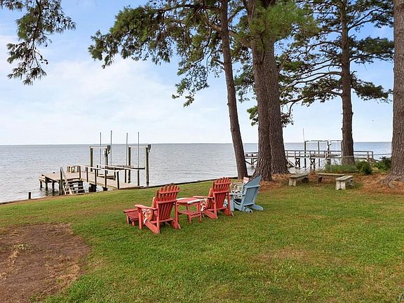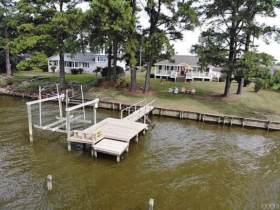 Exceptional waterfront lifestyle in your private sanctuary of comfort and charm! This home offers a recipe for relaxation. Step outside for a short stroll to the sparkling waters of the Albemarle Sound and an opportunity to swim, fish, boat, sail bird-watch or just kick back & enjoy the water views. It offers the perfect escape from city life as a weekend getaway, or a permanent home. This lot offers some of the deepest water for your boat. Entertaining is fun in the detached outbuilding transformed into a party barn. Inside features an open floor plan for living rm, dining area & kitchen.