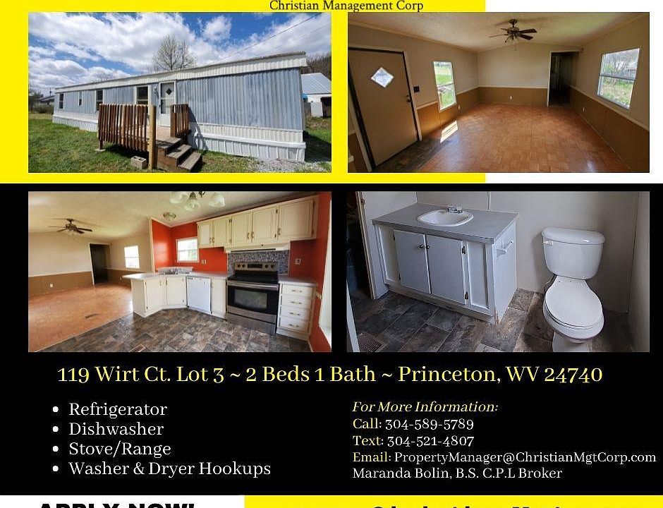 119 Wirt Ct. Lot 3 ~ 2 Beds 1 Bath ~ Princeton, WV 24740 LEASE OPTION (Path to Home Ownership): Initial payment: $1,500 with no payments due until the 1st of the following month! Monthly payment: $550/month. No utilities included. or RENTAL: Security Deposit: $550. Can be made in payments if needed. Monthly rent: $550/month. No utilities included. Sorry, this home is not HUD approved. This 900 sq. ft. 2-bedroom 1-bathroom model mobile home is located off of Old Athens Rd. behind Sarah's past the Grants, IGA crossroads. This home is located in a quaint and quiet small rented lot. It includes an electric furnace, an electric stove, refrigerator, washer & dryer hookups in the laundry room, and off-street parking. There's plenty of space to get the room layout you desire! Christian Management Corporation Office Hours: Mon-Fri 9:00AM-5:00PM & 10:00AM-2:00PM the 1st Saturday of every month You can view THIS property 7 days a week! Most pets welcome with a $200.00 pet fee per pet and signed pet agreement. Maximum 2 pets. No aggressive breeds due to insurance restrictions. Clean, safe, quiet, crime & drug-free are our priorities for our residents! We support Equal-Housing Opportunities! Good people with good, bad, low, or no credit but stable employment or Social Security are welcome. Criminal Checks: -NO recent felonies in the last 7 years -NO evictions in the last 7 years -NO sex offenders Is this property not what you are looking for? View our other available #homes, #mobilehomes, #apartments, and more on our Facebook or our website.