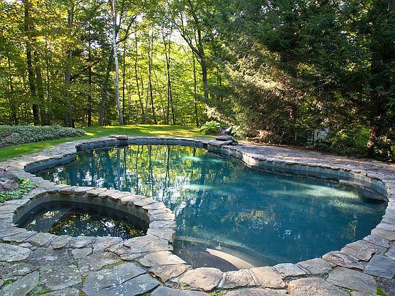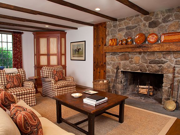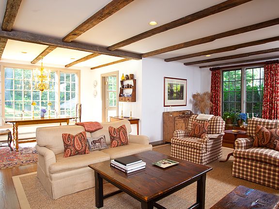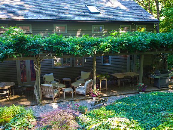 This inspired Colonial with chic interiors and wonderful outdoor spaces is the perfect blending of a beautiful home and gardens. The Living Room with natural fieldstone fireplace, hand hewn beams and wood floors opens to the Dining Room with a view to the lovely landscape, pool and mature trees. A charming country Kitchen leads to a large patio with wisteria-covered pergola overlooking an enchanted woodland setting. The 4 bedrooms and 3 full baths include a luxurious Master Bedroom suite with full bath. The Master, with vaulted ceiling, wonderful light and view, offers all the comforts. There is central air conditioning on the upper level. In addition, there's an open loft Study on the second floor and a 2-car detached garage. A perfect place for entertaining family and friends or just slipping away from it all.