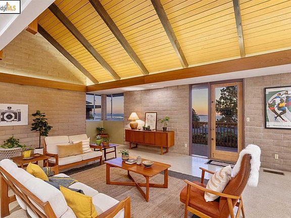 Magnificent Bay and hills views from this Mid-Century Modern gem! Built for the architect's parents (electrical engineer dad), this fine home is constructed of steel reinforced concrete blocks and beautiful natural wood. It exudes an organic warmth as well as structural fortitude. Soaring open-beamed ceilings in the living room create drama and expansiveness, then two bedrooms and 1.5 baths downstairs lead to a spacious loft and additional room which can be outfitted as a primary suite. Original details in-tact. The two car garage is 30' deep (2 cars deep?) w/ room for an additional two in the driveway, plus there is a large basement with many possibilities (home theater? music studio? home gym?). Dine on the view deck and create your dream garden in big backyard. This beautiful home has the "great bones" you've been waiting for in a prime setting and even has owned solar panels.