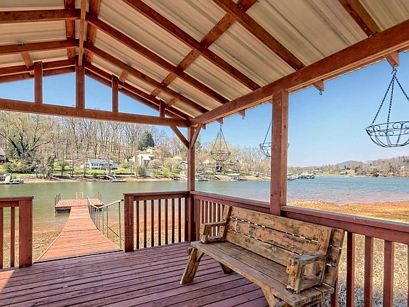 FURNISHED LAKEFRONT cabin with gentle access to the lake right from the home. There is a gazebo to enjoy all the day's activities. This home features 2 spacious bedrooms, 2 1/2 baths, 2 living rooms, garage plus an outdoor storage shed. The main level is open concept with great flow through the kitchen, living and dining areas as well as hardwood floors throughout. Each space has great light with windows and doors providing porch access and lake views year-round. The Main Level has a loft space; perfect for an additional sleeping area or reading nook. The kitchen features granite countertops with a large center island; great for gatherings and entertaining. The living area has a beautiful, stacked stone gas fireplace and plenty of room to relax and enjoy amazing lake days. The primary suite boasts a walk-in closet, ensuite bath and porch access. There is an additional bedroom, bath, and spacious living room on the terrace level. The living area is complete with wood burning fireplace and a murphy bed as well as a large sectional couch for additional guests to sleep. The basement garage offers tons of lake storage options, also on the terrace level. This is a great cabin in the mountains, on the lake right near the high bridge between Hayesville and Hiawassee tucked near a cove. Exceptional lake home at an excellent price point.