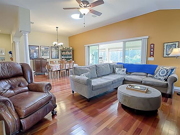 This is a PRISTINE Designer BEGONIA with GOLF CART GARAGE, in the VILLAGE of HEMINGWAY! This lovely home's curb appeal is enhanced with beautiful landscaping and stacked-stone planting beds! The living and dining rooms feature stunning BELLA WOOD BRAZILIAN CHERRY floors! The kitchen offers tile floors, an additional double pantry with pull out drawers, subway tile back splash, and under-counter lighting. Appliances include a French door refrigerator, smooth-top range, space-saver microwave, and a new Bosch dishwasher (2017)! A convenient nook and a breakfast bar for casual dining completes this light and bright space! The master bedroom suite has a trey ceiling and sliders to the lanai. There are double walk-in closets and a master bath with split vanities and a ROMAN SHOWER. The guest rooms are separated with a pocket door, and feature two bedrooms (front room does NOT have closet) and a guest bath with a tiled tub/shower. The lanai has sliding windows, solar shades and a separate A/C unit. PRIVACY is created with lush landscaping including blooming orange and lemon trees! Many energy efficiency upgrades have been added to this home including a solar shield in the attic, UV Bluelight in the A/C unit, additional lanai insulation, and UV reduction coverings on west and south windows! Other enhancements in this lovely home are custom shades in living room and Master bedroom, exterior painted in 2016, surround sound stereo speakers, water filtration system, lightening deterrent system. The list goes on..