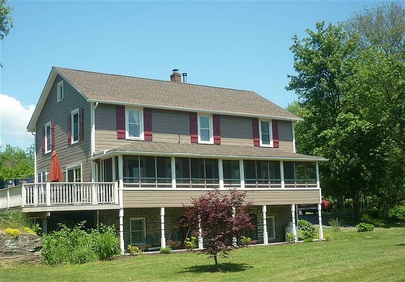 Feel the magic as you turn into the driveway of this unique and special property situated in a two acre park like setting. The vast, sunny rear yard is surrounded by woods and nature. The gorgeous blue stone patio is framed by a wall made of stones taken from the property. Enter through the new double-door entry into the open and airy first floor. Lovely wood floors reflect summer’s light throughout. The widow- filled kitchen enables you to enjoy a full view of the rear yard while preparing your meals. The huge living room is accented with whimsical artist’s touches: a book shelved lined wall, sun-filled windows and a wood burning stove to warm the heart and soul on winter days. The dining area features a side door to a new deck which awaits your barbequing expertise. After dinner, take the party out to your full width enclosed rocking chair front porch for some fresh air and a nightcap. The second floor offers five rooms, giving you an assortment of options. The newly renovated