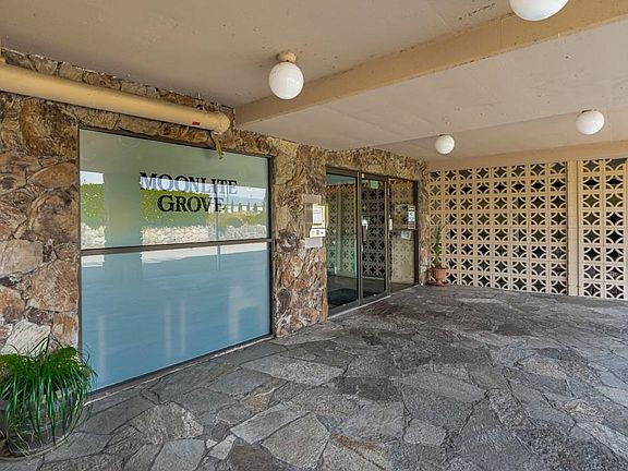 Welcome to MOONLITE GROVE 55+ Community! This TOP FLOOR 2 Bedroom/1.5 Bathroom unit has updated bathrooms and laminate flooring throughout. The main bathroom includes a jetted walk-in Tub/Shower for safe and easy bathing. Lovely Large Bedrooms! Kitchen has oversized prep island breakfast bar which opens to Dining area. Cozy west facing Balcony off the Living Room to enjoy those beauty sunsets and view of Mountains to the right! In Suite Laundry with full size Washer & Dryer. Includes parking for one vehicle in Parkade and lots for visitors out back. This very well maintained Building has an Elevator. Must be 55+ One cat ok, no dogs. Wonderful location across from Valley Fair Mall. Recreation, Transit, Shopping, Dining etc all right here!