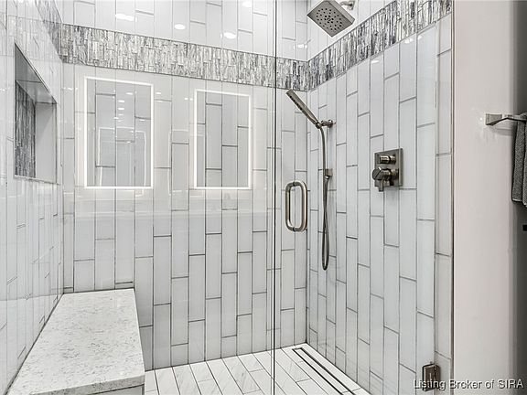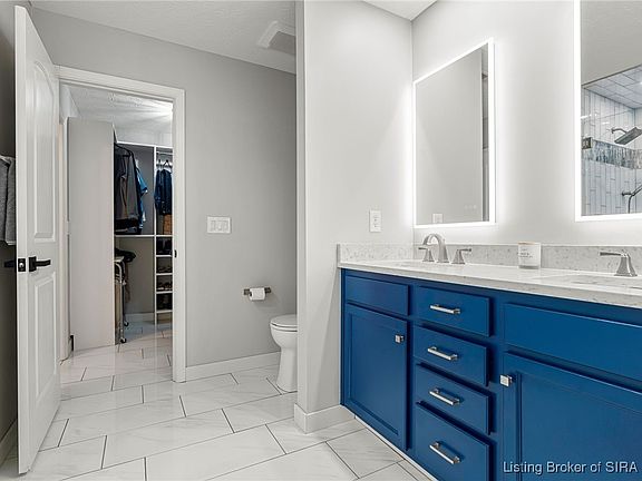 laundry room. The primary bedroom leads to its own elegant bathroom with a walk-in shower, double sinks with programmable, backlit mirrors and primary closet with built-in cabinetry and shelving. The closet also opens to the laundry room. With new flooring throughout, fresh paint, updated lighting, custom closet shelving in additional bedrooms and a 50 amp electrical outlet in the garage (for car charging) this home is ready for a new owner. Large mirror, washer and dryer stay with the home. Easy access to 1-65 bridge or Sherman Minton bridge. Call for your private showing today!