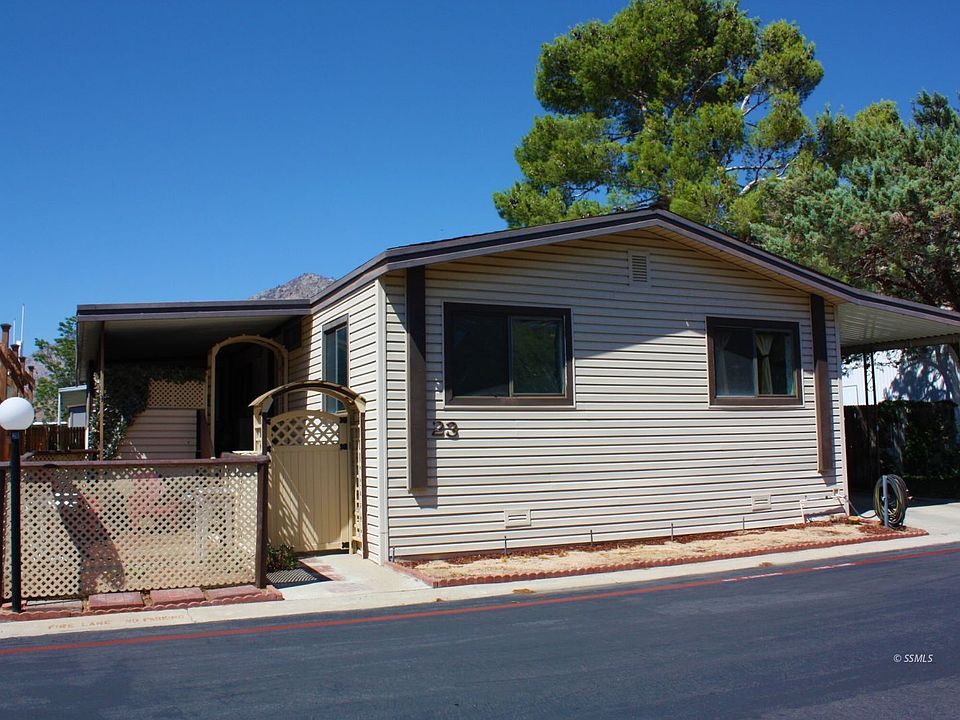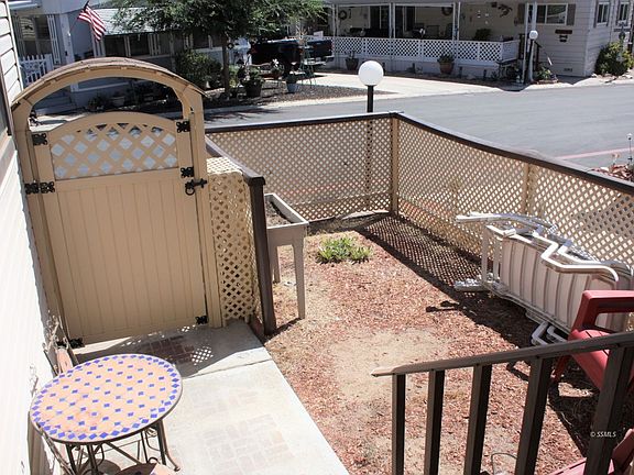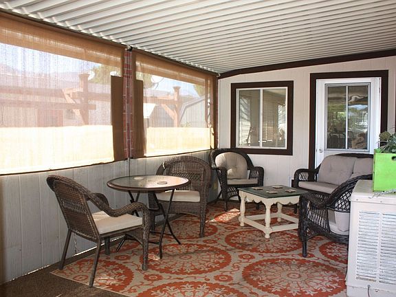 Decorated with an English Flare this place is pretty neat !! The home is 2 bedroom 2 bath split wing floor plan. There is a permitted addition that is used now for and office and exercise room but has a closet so could be a third bedroom. Beautiful fenced entry with covered patio porch area. The living ,Kitchen & dining are great size with open floor plan. Nice vaulted ceilings, vinyl plank flooring through out & custom kitchen & appliances. Nice big in-door laundry with both a gas & electric dryer. The guest bedroom and bath were in the process of being finished so all the flooring and paint supplies are available. There is enough to do the laundry also if you choose. All furnishings stay along with all appliances. There is even a full set of Armour in the dining room to enjoy. Nice pellet stove & force air heating along with evaporative cooling & air condition. The home has nice vinyl siding and roof is 2 years old. Water heater is fairly new.Covered Carport and a nice storage shed with electric. The park has a beautiful clubhouse with game room and pool area. All roads are paved. Close to shopping and many year round outdoor activities. Park approval are required.