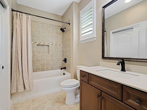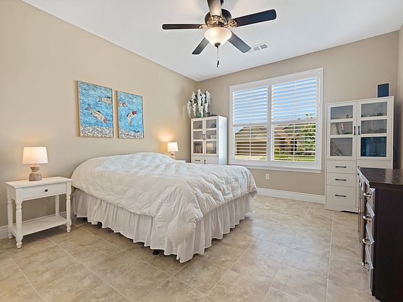Inside, the open-concept layout creates seamless flow between living, dining, and entertaining spaces. The kitchen is a chef’s dream, featuring sleek Cambria countertops, stainless steel appliances, an oversized island, induction cooktop, and custom roll-out cabinets for effortless organization. A built-in dry bar with glass-front cabinets, accent lighting, and a wine refrigerator adds a stylish touch. Plantation shutters, oversized tile floors, and expansive windows fill the home with natural light and timeless character.