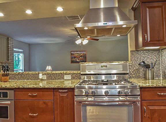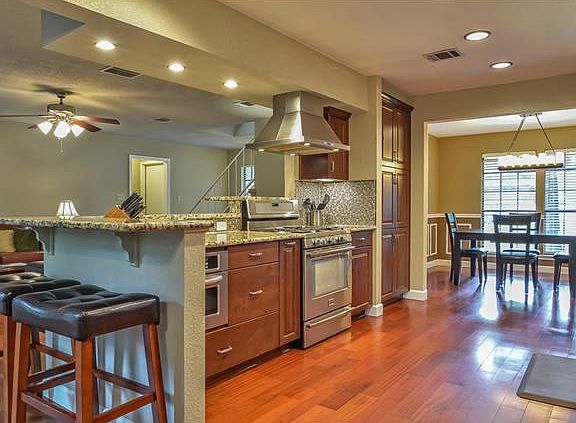 Beautifully updated home, tucked into cove backing to Greenbelt. Amazing view & privacy in backyard, surrounded by mature trees w/large deck. Freshly painted interior & new carpet.Wood floors downstairs living area. Gourmet chef's kitchen opens to family room, high end cabinetry including soft close drawers, granite, glass tile backsplash, stainless appliances & breakfast bar. Master bed is down w/newly tiled bath granite counter & walk in closet. Oversized game room, 3 large bedrooms & updated bath up.