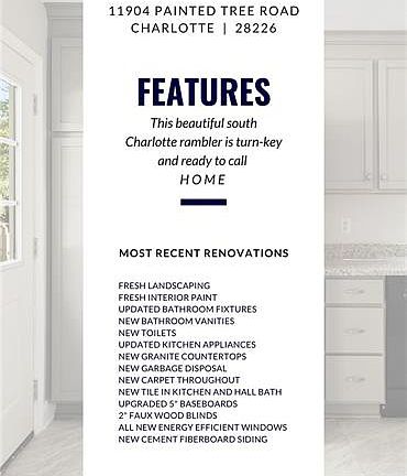 Wonderfully renovated rambler nestled on nearly 1/2 acre corner lot just off Carmel road, in south Charlotte. This beautiful oasis is located right in the heart of everything the queen city has to offer, yet tucked-away in a serene setting. Your new home is just around the corner from the Charlotte's haute Ballantyne area and you can access the McAlpine Creek Greenway from your new community's private trail-head. Your new neighborhood also includes a pool, tennis courts and HOA to protect your investment. Too many upgrades to mention, this amazing home has been loaded with top notch upgrades from, new HVAC compressor, updated plumbing, new bathroom fixtures, intricate crown dental molding and upgraded 5' baseboards, new flooring throughout, granite counter-tops, updated vanity and cabinets throughout to make it turn-key and ready for you to call home. Don't miss out, schedule your before its too late! Virtual showings available upon request.