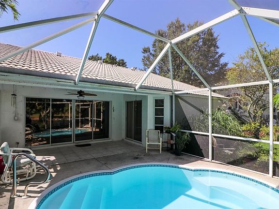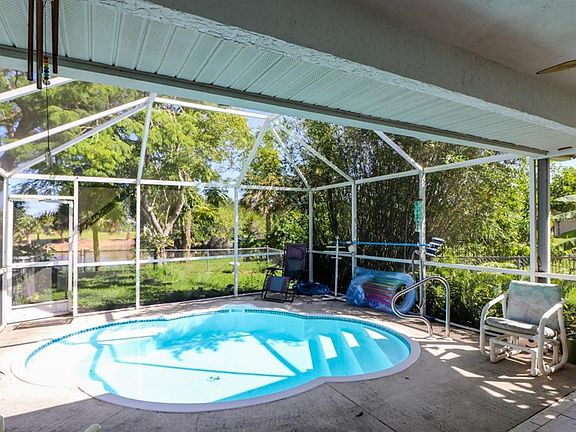 A waterfront lush Florida landscape awaits. As you walk up to this lovely home notice the fruit trees such as mango, coconut, meyer lemon, guava, and banana, smoothie anyone! Entering the home you will notice the well appointed eat-in kitchen with stainless appliances, wood cabinets and granite counters, there is even a large pantry. The kitchen is open to the great room which has vaulted ceilings and a large slider offering plenty of light and a view of the pool and canal. The large master offers a walk-in closet and en suite. The two guest bedrooms are of equal size and are found down their own hallway with the guest bathroom. This home comes equipped with a central vacuum system for ease and convenience. Outside you will enjoy your large lanai and solar heated fiberglass pool. There is a fence in place perfect for pets. The shed provides extra storage and there are gutters all around with leaf guard gutters on the front of the home. Enjoy fishing, kayaking and electric motor boating from your backyard. Brand New Septic and Field!