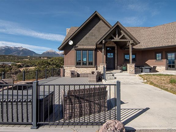 Fabulous Horse Property! Gorgeous, treed, and fully fenced 35+ acres. Private, serene, & ideally located. This exceptional property truly has it all! The stunning custom home has been very lightly lived in, and the separate entertainment studio is an incredible bonus for gatherings and relaxation. The property features a five bedroom septic system for the home and a two bedroom septic for the barn facility. Step inside and feel the excitement of the design! A beautiful foyer welcomes you into the gourmet kitchen, complete with an expansive island perfect for entertaining, double wall ovens, a six-burner gas range with additional oven and warming drawer, a commercial size refrigerator, beverage fridge, custom cabinetry, and a striking chandelier. The open dining and family room are lined with windows on the south and west sides, capturing breathtaking views of the Collegiate Peaks and the southern valley. Two primary bedroom suites each feature luxurious ensuite bathrooms. The main suite offers an impressive walk-in closet with custom built-ins and its own washer and dryer. The home includes two additional utility rooms, one on the main floor with cabinetry and a dog shower, and another on the lower level. The upper level offers a private guest suite with a spacious bonus room, full bath, and large bedroom. The walkout lower level provides a fun family area, dining space, two bedrooms, and a full bath. Outside, a circular paved driveway leads to the three car garage. The west facing patio is perfect for entertaining, featuring a detached studio with a full kitchen, living area, and glass garage door that opens to the patio for seamless indoor-outdoor enjoyment. There’s even space to add a ¾ bath if desired. Then you have the barn and large garage area. It's amazing in itself. It's heated, blown in insulation & 3 garage doors. The 660' studio is not included in the sq.ft. above. Call now for private showing and Welcome Home!