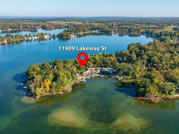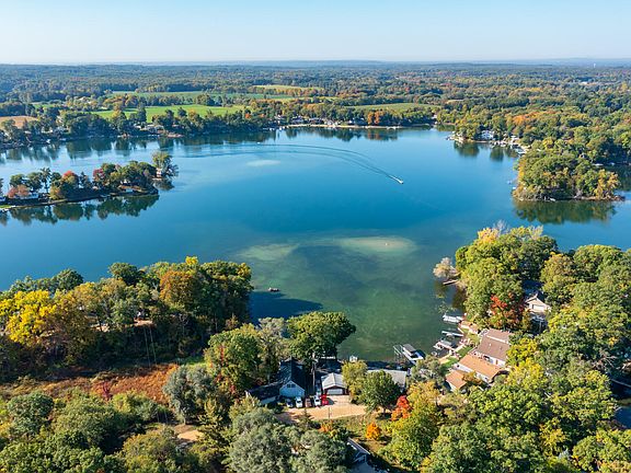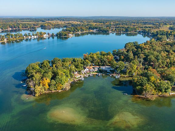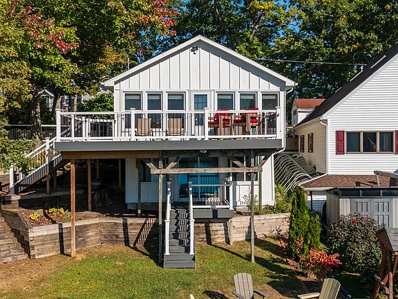 interconnected lakes totaling over 660 acres and 12 miles of shoreline making this an amazing place to live! This 2 bedroom, 1.5 bath is a perfect summer getaway and includes the dock! The owners have made many updates including a new kitchen with appliances, lighting, bathrooms, windows, furnace, large composite deck, landscaping and seawall! The open floor plan is ideal with a gorgeous cathedral wood ceiling and amazing views of the lake! A main floor bedroom and full bath with a large walk in shower is convenient. The lower level has a family room with sliders out to the lake, a nice size bedroom and 1/2 bath. This bathroom is plumbed for a washer and dryer. The large composite deck is spacious and has many seating areas. There is a wonderful bonfire pit area and an additional shed for storage! Turnkey is an option! Chicago and Detroit are a short 2.5 hours away. Call today to visit this beautiful lakefront home!
