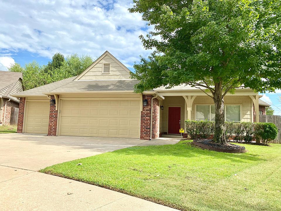 Beautiful one story, three bedroom, two bath home located in a great neighborhood in Jenks on a cul-de-sac. Premium flooring, office or bonus room, vaulted ceilings throughout, large granite island in kitchen with plenty of cabinets, and stainless steel appliances. Large master bath with his and hers closet. Entire house is freshly painted, brand new fans with remotes, new hardware and updated lighting throughout. Three car garage, sprinkler system for large back yard with gate to common area. On site storage building in back yard. Owner provides lawn care and two house cleanings per year. Renter responsible for all utilities. No smoking, no dog over 30 lbs. with a $1000 non refundable pet deposit.