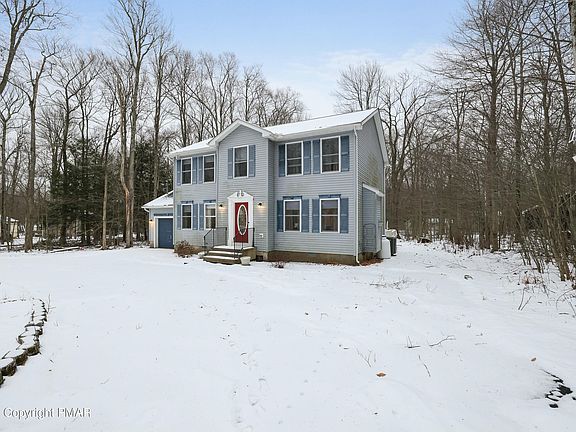 Remarkable four-bedroom, 2 and Half Bath colonial home with A CIRCULAR DRIVEWAY in Pocono Summit situated on a spacious corner lot of .76 Acres. This elegant home features a cozy living area, Large Kitchen with BREAKFAST BAR overlooking the back yard and Spacious Back Deck with an above-ground pool(need TLC) perfect for living arrangements of a larger Family, or even for Entertaining! Property Features a 1 Car Garage for storing needs or simply to keep your car protected from the elements. The House has CENTRAL AIR for HEATING AND COOLING, for year round comfort! The Primary En-Suite is Large and has a beautiful Soak Jacuzzi Tub for more RELAXATION! 3 other bedrooms on the 2nd floor are also spacious and cozy all at once! This is a must-see gem in a serene neighborhood! Community Also features a lake & Playground for your needs! Do not forget this house comes fully furnished!