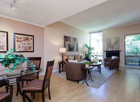 UPDATED top floor corner unit condo w/ high ceilings & abundant natural light. Painted w/ designer colors thruout. Light wood grain flrg, gas frplace, & carpeted bedrm. Granite kitchen countertops. Oversized master bedroom,sitting area & walk-in custom closet. Updated full bathrm. W/D in unit. Private balcony. Secured garage pkg. Add? l storage. Pool, spa, tennis & bsktball cts. Next to Bay Trail.
