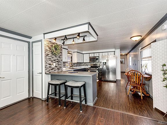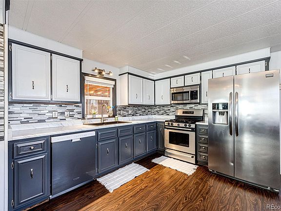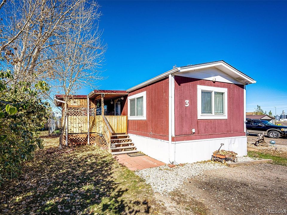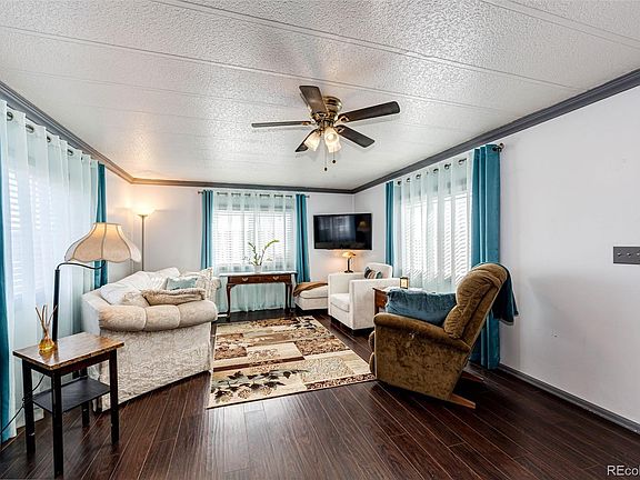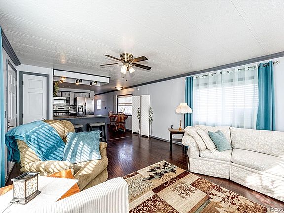 A tremendous opportunity to own this beautifully updated manufactured home in Galbraith Estates in Strasburg. Competitively priced and tastefully updated throughout, this home provides quick access to I70 and just 20 minutes to the Denver Metro Area. Upgrades include vinyl windows, laminate flooring, stainless steel appliances, amazing backsplash, a granite farm sink, and a video security system. Additionally, the roof and some windows were replaced in 2023, furnace replaced in 2021, and central air conditioning added in 2023. Enjoy the incredible Colorado evenings from the covered front porch while watching the attached tv or listening to the attached Bose speakers. Within your fenced backyard you will find mature landscaping, a raised garden bed and for additional storage, a spacious utility shed with a loft, electricity, and lighting. This home offers great space for an even greater price.