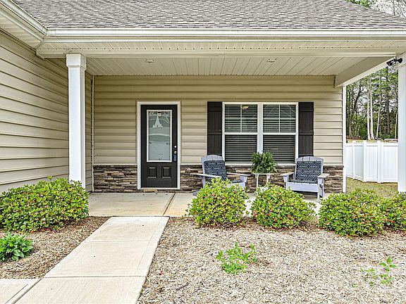 Immaculately maintained four year old home in Pecan Ridge. This 1 1/2 story plan is 1704 sf with the primary bedroom on the main level. Two additional bedrooms and full bath are up. The primary bedroom suite has a ceiling fan, walk in closet, double vanities, expanded tiled shower . The open plan for the great room and kitchen area have beautiful LVP flooring, kitchen island, shaker style white cabinets, granite countertops, stainless steel appliances, ceiling fan, pendant and canned lighting. The entire paint scheme is a designer choice of off white for easy matching with any decor. Also on the main level is large laundry room, additional powder room and access to finished two car garage. Owners will enjoy the inviting large covered front porch. Out back find the patio, private backyard with lot extension to large wooded area. Very convenient to new Fort Mill schools and many amenities constantly being added to the area. Security camaras on the front porch and rear patio to convey.