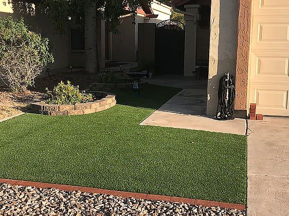 Secured gate to front entry into private patio; beautifully landscaped front and back yards. Back yard has pavered sideyard to beautiful turf yard (no mowing, no watering!). Extended covered back patio with travertine; pergola; landscaped with plenty of greenery.