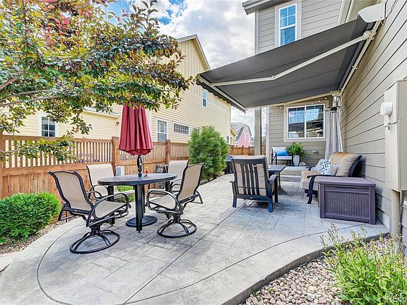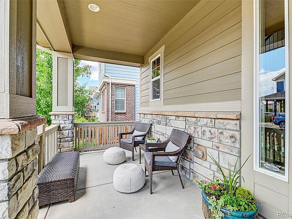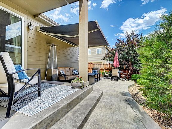 Picture perfect decorator's dream in desirable East Bradburn. Upgrades abound in this show-stopping home! You are welcomed by an inviting covered front porch, which beckons you inside. Stunning wide-plank wood floors flow through the open-concept main level and draw you back to the heart of the home. The exquisite kitchen features an elegant Silestone quartz island, travertine stone backsplash, light-colored cabinetry and stainless steel appliances. The spacious living area is complete with a gas fireplace with upgraded tile surround, built-in shelving and designer drapes that leads seamlessly to the attached dining area. Sliding glass doors connect to the outdoor living space accentuated by a stamped concrete patio, retractable awning and fire table. An ample private office with French doors, powder room and mud room with built-in shelving complete the main level. Upgraded carpet and iron balusters flank the stairway to the upper level. Retreat to the luxe primary suite highlighted by a soaking tub, tiled glass shower, granite dual vanity and walk-in closet. An upper-level laundry room, a second full bath and three additional bedrooms (one non-conforming) round out the second floor. The full, unfinished basement with egress window and bathroom rough-in offers plenty of room for expansion or storage. Some of the many upgrades include: remote control blinds, high end carpet, wide plank wood floors, all kitchen and bath surfaces/tile, 9' basement ceiling, stamped concrete patio, new roof in 2022, new dishwasher in 2020, new AC in 2019. The Bradburn community is conveniently located near miles of trails, restaurants, shops, Whole Foods and quick access to I-25.