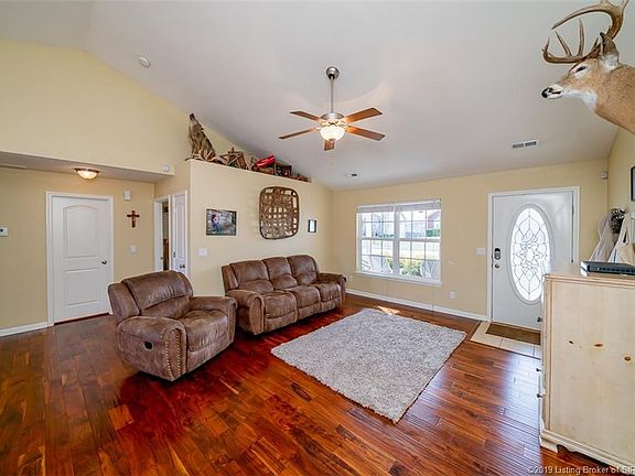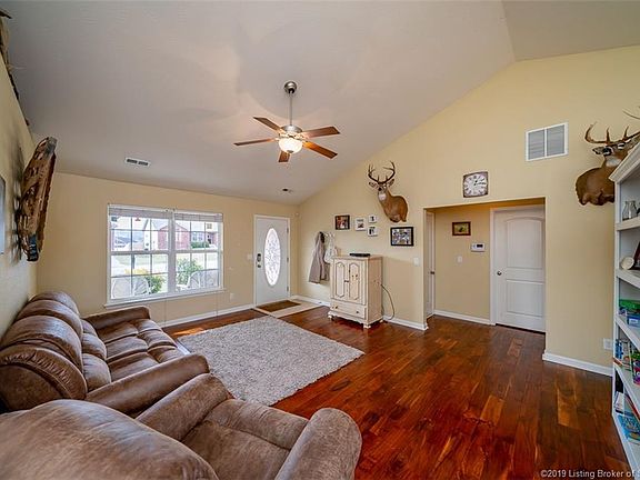 Beautiful home with split bedroom design and filled with upscale features. Vaulted great room along with an eat in kitchen. Includes all kitchen appliances, wood cabinetry and ceramic floor. Along with ceramic in foyer, laundry and bath. Features Spanish lace textured walls throughout. The master suite features large tub with seperate shower and double sink vanity. Nice back patio for grilling and beautiful covered front porch for sitting out on those nice nights. Close to shopping in Clarksville or Louisville, Ky. Sq ft & rm sz are approximate.