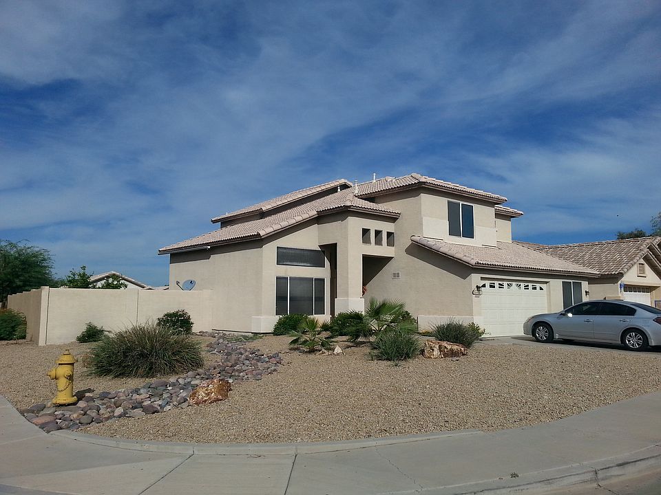 Spectacular Peoria home on large corner lot with meticulous desert landscape and great curb appeal! This move in ready home features vaulted ceilings, custom paint, gorgeous wood and tile flooring, and picture windows that allow natural light to highlight every perfect detail! Family room/kitchen combo! Family room has cozy tiled fireplace! Eat in kitchen, abundance of custom cabinets, ample counter space, and a center island! All NEW Appliances! Grand staircase leads to the spacious bedrooms and a quaint loft! Master suite has a personal exit to the private balcony, walk in closet and a spa like bath with separate shower & tub and dual sink vanity! Two car garage floor to ceiling cabinets! Serene backyard is complete with a covered patio, lush green grass and mature trees! See it today!