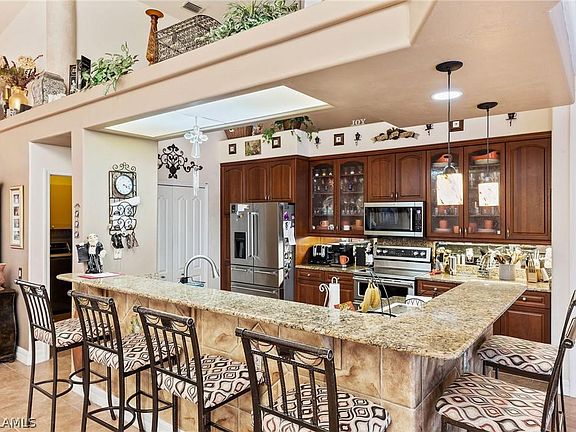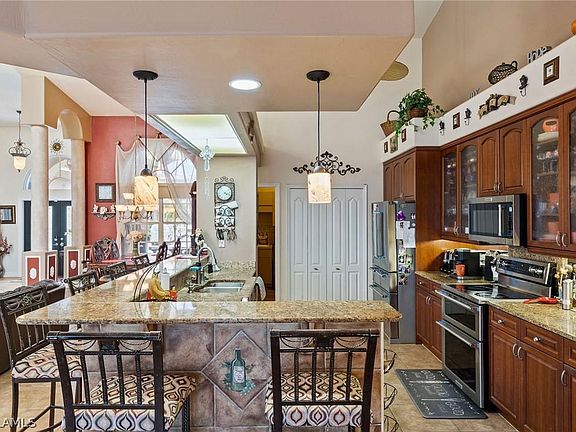 Classic Executive Pool Home with open floor plan situated on Cape Royal's "Prince 7" Fairway with fantastic Lake Views. IMPACT Doors and Sliders w/Tinting that offer Light without Heat throughout this beautiful home. Two out of the four sliders POCKET fully into the wall. Chef's Kitchen has a Large Versatile Island with an eat-in Breakfast Nook, Cherry Cabinetry, High-End Kitchenaid Appliances including a double oven, and Timeless Granite Counters. The Master Suite is oversized w/Sitting Area, His & Hers Vanities, Built-in Jacuzzi Tub, Separate Shower, and 2 Walk-in Closets. Bedroom 2 has slider out to the pool w/Electric Blinds and Bedroom 3 is Large w/Electric Blinds. The 2nd Bath with Tub/Shower Combo doubles as the Pool Bath. Hot Water Heater is new, May 2022. New Metal Roof with Skylights, 2020. A/C was Replaced in 2017. Surround Sound throughout the home. The Den is 16 X 20 with French Doors, The garage has 2 Closets, Shelving, and a Double Door entry for your Golf Cart. Heated Pool & Spa w/outdoor kitchen complete the lanai! Your home is Located in Unincorporated Lee Cty which means Lower Taxes, Low HOA Dues & Friendly Neighbors this Home and Community are Perfect for You!