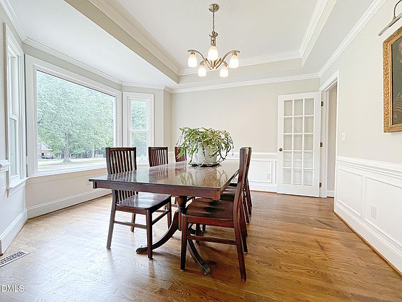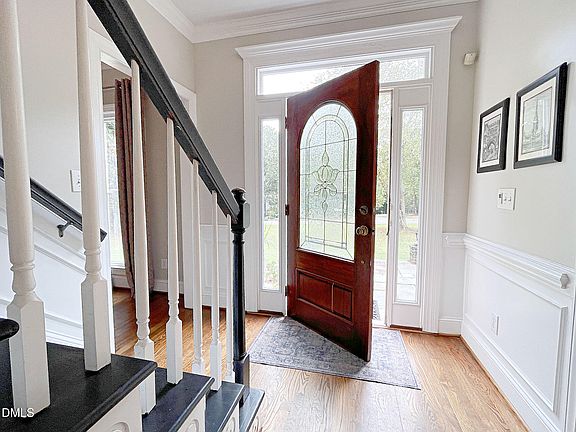 Relax and enjoy the quiet setting of this beautiful transitional home with bright open floorplan on a huge flat .93 acre lot! PLUS-- 4 car garage!! NEW CARPET throughout! Foyer with hardwoods and wainscot. Dining room with trey ceiling, bay alcove, hardwoods, wainscot and crown molding. Living room with hardwoods and built-in bookcases. Family room with stack stone fireplace, wall of windows and ceiling fan. Family room opens to the sunny Kitchen with center island, 42'' cabinets, granite, tile backsplash, walk-in pantry, hardwoods and spacious breakfast nook. Second floor includes Large Primary bedroom with lots of windows, walk-in closet and Primary Bath with dual vanity, tile floor, jetted tub and separate tile shower. Also included are a large bonus and spacious secondary bedrooms. Laundry room with shelving and tile floor. Third floor with Fitness room/Flex space and Office with built-in bookshelves. Attached 2 car garage and detached 2 car garage with a huge bonus/office above. Massive deck with stone fireplace is great for entertaining!! Fenced park-like backyard. And check out the amazing Koi pond! Close to Falls Lake, shopping, dining and I-540.
