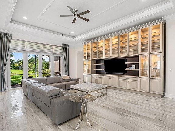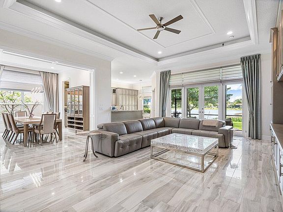 Valencia Cove's JULIA model with bonus room is a stunning one-story home with long lake views and designer upgrades throughout. Featuring 3 bedrooms, 3.1 bathrooms, office/den and a bonus room. Chef's kitchen with plenty of built-in storage and custom impact french doors leading to a screened patio. Wood-like porcelain tile floors throughout. This premier 55+ community offers sports facilities, 4 pools, a clubhouse, table service dining, fitness center, card rooms, and more, with 2 gated entries for added security.