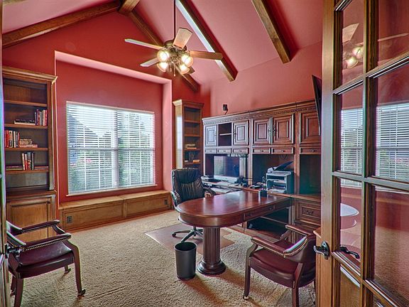 Beautiful Builders personal home features the finest of upgrades in this "Energy Star" home.. Recent updates include top of the line Samsung appliances in the kitchen, Instant Hot Water in Master Bathroom, Storm Shelter in the 3 car garage. Exquisite Metal and Glass front door leading into spacious foyer with a breathtaking view of the lake from the family living area. Home office off the front hallway features built in bookcases as well as French doors. Main living area is open to kitchen and all views overlook the beautiful lake. Master Suite features sitting area as well as lake views from over sized windows. Relaxing on the patio overlooking the lake is a great way to relax and unwind or to entertain family an friends. Quality shows in every detail as well as the various upgrades that will reduce energy costs for years to come. Private showings available on this distinctive home in a wonderful location .