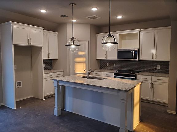 McLemore Classic Floor Plan - 4/3/3, 1 story - Greenbelt homesite with large covered back porch. Black windows on front with metal awning. Kitchen w/ stainless gas appliances, painted cabinets with 42" uppers, corner pantry, granite counters, large island with decorative legs and pendant lights. Wood plank tile in living room/kitchen/hallways. Vaulted Living Room. Spacious master suite with 5' shower, dual vanity, private toilet and walk-in closet. Enlarged utility with mud cabinet. Energy Star Certified.
