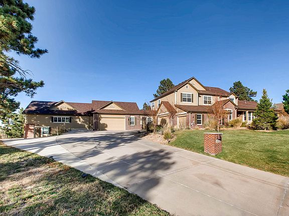 Incredible Mountain Views from this stunning 6 bedroom, 7 bathroom house on 3.2 acres in Bell Cross Ranch in Parker. Situated on a cul de sac on the highest point in the neighborhood, enjoy the sweeping views from both the front and back of the house! 7 car attached garage includes indoor RV parking,a 2000 lb hoist, room for a car collection, and is designed to be finished into a mother in law quarters if so desired. The main floor features a gourmet kitchen, family room w/custom cabinets, living room, dining room, den/office & full bath. Spacious Master Suite includes custom cherry cabinets, 5 pc bath, huge walk in closet. All upstairs bedrooms have attached bathrooms! Fully finished walkout basement w/wet bar & wood burning fireplace. Check out the heated outdoor reclaimed barnwood kitchen featuring top of the line appliances, 60" plumbed in gas grill, & bar seating. 3 fireplaces, cherry hardwood floors, $20K worth of window treatments. Beautiful landscaping, tons of trees.