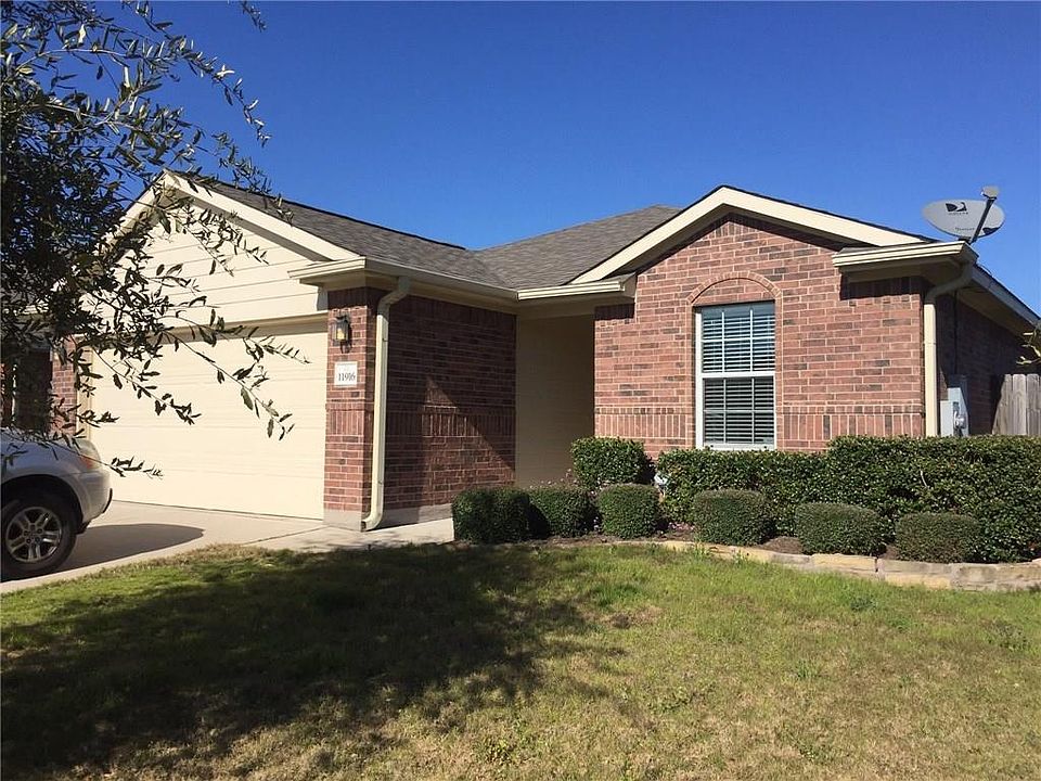 Beautiful, open concept one story home. Huge kitchen with corian counters, island, tons of kitchen cabinets, black appliances feature gas range, refrigerator, microwave, dishwasher and garbage disposal! Tile & wood-like floors throughout, carpet is only in secondary bedrooms. Private yard with no back neighbor featuring a covered patio with fan & large deck. Huge side yard with separate dog run & storage area. Harris Branch Community Center is 1/2 mile away with playground, pool & basketball courts.
