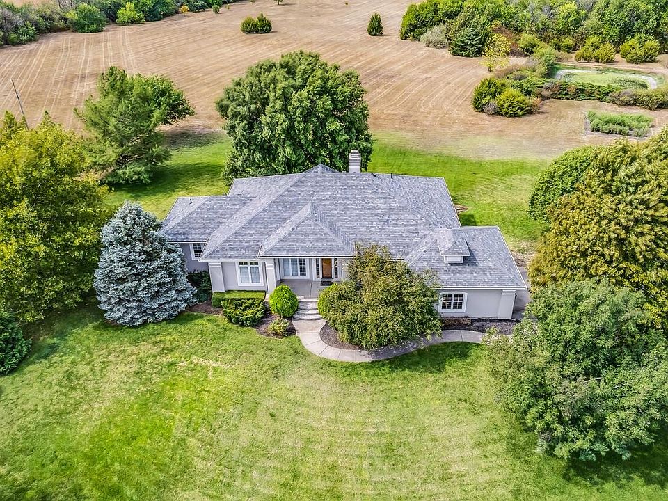 Great country estate in the Derby school district! Awesome ranch home sits on 5.07 acres with privacy, trees & a huge outbuilding!! This easy flowing custom built home is perfect for entertaining inside or out with large windows, deck and spacious rooms. The main floor boasts a foyer that opens to the living room with a two-way fireplace & a large formal dining room. The heart of this home lies in the huge kitchen/family room! The large kitchen features wood floors, quartz counter tops, island cabinet with an eating bar, walk-in pantry and tons of cabinet space. An adjoining family/hearth room lends beautiful lighting to this entire area with large windows and the two-way brick fireplace. The master suite has a bay window for taking in nature, custom ceiling, a door to the deck & a large walk-in closet! The incredible bath features a large walk-in shower, 2 sinks, vanity area & a jetted tub. The main level also boasts an additional bedroom, bath & a separate laundry room. The finished basement offers additional living space for family and guests and boasts a rec room/game room (plumbed for the 2nd fireplace), 2 bedrooms, bath & a large storage room with built-in shelving! This stunning property is not to miss! 5.07 acres, 2 car side load garage, partially covered deck, brick patio & a 26x40 outbuilding with an oversized door big enough for an RV or many cars! This property has it all! Don't miss out! New roof 2022! *Since the exterior pictures were taken the lagoon has been moved to the South.