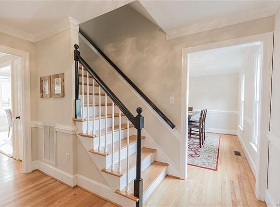 Beautiful home with open flow. Kitchen open to family room which is open to living room. Crown molding, chair railing and 8" baseboard molding throughout 1st floor. Updated kitchen with granite countertops, stainless steel appliances and custom backsplash, new recessed lighting and built-in desk, ceramic tile floor, walk-out Bay window. Convenient laundry room off kitchen and side entrance. Lovely Sun room with vaulted ceiling and two sky lights. Huge master suite with walk-in closet, large dressing room or office and master bath. Three additional bedrooms plus rec room, play room room on 3rd floor. Additional storage room on 3rd floor. New Dimensional roof, vinyl replacement windows, new hot water heater-2017, two-zone heating and air conditioning. Fenced rear yard.