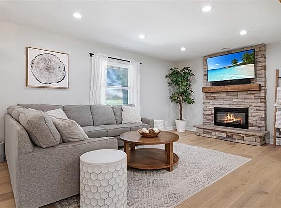 Lovingly and extensively updated, this Blue Valley Schools two-story has it ALL. Picturesque curb appeal with full-width covered front porch, lush green grass and mature landscaping. Modern, bright, and open - you will feel right at home from the moment you walk in. Hardwood floors throughout the main level, stone gas fireplace, stunning designer kitchen with gas range, quartz countertops, and coffee bar. Formal dining/living room/office with wainscoting detail all around. Upstairs - 4 bedrooms feature hardwood floors throughout. Primary suite with tray ceiling, completely renovated ensuite bath with custom frameless glass ceramic tile shower, new vanity, and floors. Second bathroom also completely updated with extra deep tub, ceramic tile surround, new vanity, floors and stone feature wall. More finished living space in the basement with ample storage. Out back you will fall in love with the covered back porch. Sit by the covered outdoor stone fireplace and watch tv; Entertain your guests with a dinner al-fresco under the pergola; Whip up a family BBQ in the outdoor kitchen featuring stone surround and concrete counters. Even the kids will be pleased with the large yard to play and custom playhouse (even pre-wired for electrical). The list of upgrades and updates goes on and on : NEW HVAC, Gutters/guards, exterior siding/paint, water heater, 200 amp electrical, pex plumbing, irrigation system in front, insulation.. With NO HOA and a new concrete pad you'll have plenty of room for toys/camper/3rd car; all perfectly situated between 135th and 143rd.
