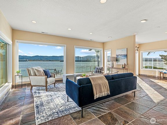 Landmark Columbia River Waterfront home w/258' low/medium bank waterfront. Gated, secluded, walled compound w/AMAZING river views. Open floorplan w/lots of natural light. Steam room and jacuzzi tub in large upper primary. Main floor primary w/three quarter bath. Granite countertops, tile & slate floors. EZ care landscape w/irrigation system, no mower required. Well/septic mean no water or sewer bills. Detached shop/boat shed and its own private boat ramp plus an RV pad. Watch the ships cruise by from expansive deck; windsurf, drop a line & fish, kayak or launch your watercraft without leaving the compound. Stargazing, ship watching & killer sunsets await! Don't miss this opportunity to call the INFAMOUS "blue tile roof" home your very own!
