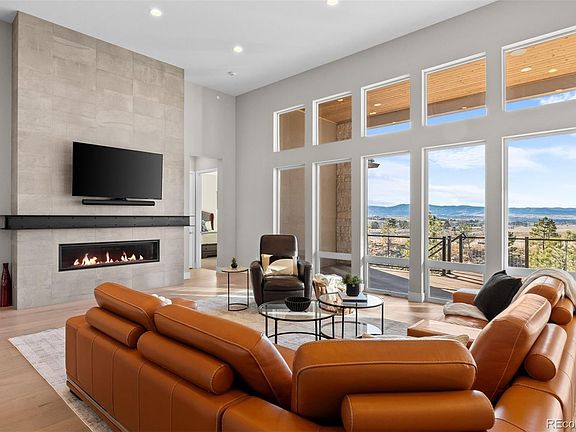 If you missed this extraordinary home the first time, take a 2nd look! PRICED BELOW MARKET, this is a rare opportunity to own a like-new, award-winning 4 bed | 4 bath residence with breathtaking wall-to-wall sunset | mountain views in the gated, coveted Village at Castle Pines community. Entering the foyer, you’ll find a stunning glass-walled office to the right and a convenient 2nd bedroom with en suite bath, laundry room, and powder room to the left. The impressive great room, with soaring ceilings and expansive windows framing magnificent mountain scenery, is complemented by a striking 65” linear fireplace with a custom iron mantel. The well-appointed kitchen features top tier JennAir appliances, Sub-Zero refrigerator, and quartz counters, all centered around a sleek island with bar seating for 4. The adjacent dining area comfortably accommodates gatherings of up to 8, and opens to a large main level deck - perfect for watching brightly hued sunsets and dramatic weather rolling in over the peaks. The primary suite is a serene retreat, offering automated shades, a custom closet, and seamless access to a huge spa-inspired en suite bathroom with dual vanities, soaking tub, and an enormous shower. The spacious, light-filled lower garden level features versatile areas for recreation, fitness, and entertainment. 2 large bedrooms, a full bathroom, and a huge, unfinished storage room - perfect for customization and expansion - round out this floor. Practical yet luxurious touches include solid core doors, 5-inch engineered wood floors, Navien tankless water heater, and in-ceiling speakers. 3- car garage. Nicely maintained and nearly new, this open concept residence captures the essence of refined Colorado living. Perfectly located within walking distance to dining, shopping, fitness facilities, pools, and sport courts, this home harmoniously blends the low maintenance luxury, convenience, views, value, and beauty you've been waiting for.
