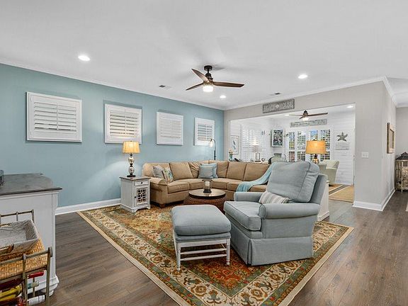 Spectacular 3BR-2BA(+Study) Home in The Sanctuary at Withers Preserve at Market Common! The Summerwood floor plan defines efficient single-story living. Walking in the front door you will notice the wood laminate flooring in the foyer, living area, kitchen & dining room, the custom crown molding, wainscoting and ship lap finishes and plantation shutters throughout the home. The guest bedrooms, laundry room and office/study with French doors are located along the entry hall. The entire home has 9ft. ceilings. The merging of the open kitchen, living room, dining area & Carolina room making it perfect for entertaining. The chef's kitchen is sleek and modern with granite counter tops, custom white cabinets, built-in microwave, a natural gas cook top with vented hood and stylish subway tile backsplash. This gourmet kitchen also meets many of your needs with a work island/breakfast bar and a large pantry. The luxurious master suite has a tray ceiling, sitting area, custom raised double sink vanity in the bath, oversized tile shower and walk-in closet. Notice the charming sliding barn door separating the bedroom & bath! Coming in from the garage is a the spacious laundry area and another sliding barn door! Located off the Carolina Room is a quiet, private fenced backyard oasis with a nature view. A powered Sunsetter Awning with LED lights has been added and the patio has been expanded with stone pavers. A total list of up-grades is available.
