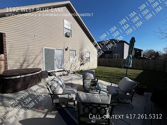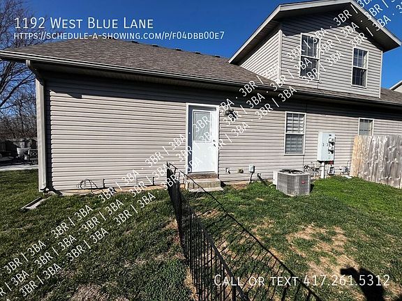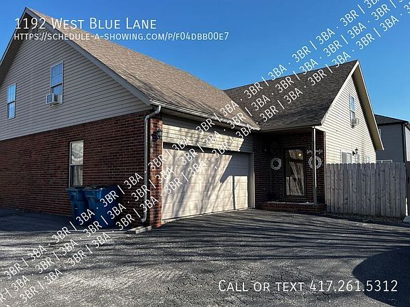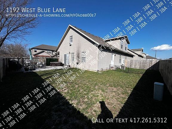 Welcome to 1192 West Blue Lane, a beautifully maintained 3-bedroom, 2-bathroom home in the highly sought-after City of Ozark! This lovely property offers the perfect combination of comfort, convenience, and peaceful living, just minutes away from schools, shopping, and outdoor recreation. Key Features: - Spacious 3 bedrooms and 2 full bathrooms for comfortable living - Bright and open living area, perfect for entertaining or relaxing - Modern kitchen with plenty of cabinet space, appliances included - Cozy master suite with private bath and ample closet space - Fenced-in backyard providing privacy and a great space for outdoor activities - Attached 2-car garage for convenience and additional storage - Central heating and cooling to keep you comfortable year-round - Pet-friendly with approval (ask about our pet policy) This home offers a peaceful escape while keeping you close to everything you need. Located in the picturesque City of Ozark, you'll enjoy easy access to highways, parks, and top-rated schools. Whether you're commuting to Springfield or enjoying the beautiful Ozark surroundings, this home is the perfect place to call your own. Schedule a showing today! Don't miss out on this fantastic opportunity to live in one of Ozark's most desirable locations. Mowing