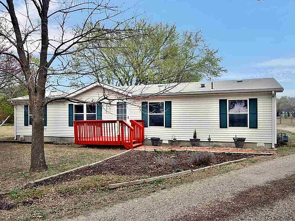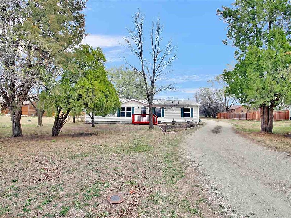 Nice Manufactured home sitting on .88 acre lot in a convenient SE location. This large lot perfect for your garden is already beautiful with perennial beds and nice landscaping. There is a wood deck on the front as well as large deck on the backside of home for your outdoor living. Detached 3+ car garage is wonderful space for your vehicles or workshop. The home is spacious with a centrally located living room, split bedroom plan with a Master bedroom and private bath at one end of the home, large kitchen with good sized dining area. Main floor family room as well and 2 additional bedrooms with full bath at the other end of the home. This property offers a lot of sq ft for the money and amenities that you would often find in a country property, but located right in east Wichita. Schedule your showing today!