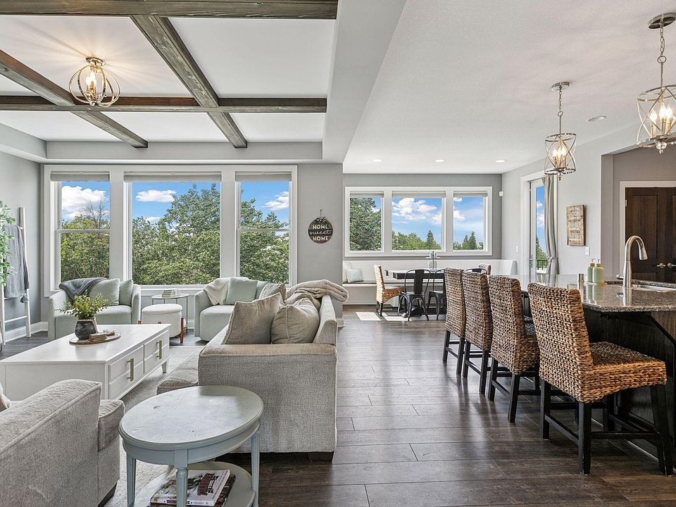 Island seatingDramatic floor-to-ceiling stone fireplaceProfessionally landscaped backyardVaulted stairhallWood ceiling beamsExpansive family roomSoaking tub