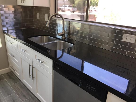NEW ROOF. NEW AC. True remodel from top to bottom. Kitchen boasts white shaker cabinets with trendy brushed nickel hardware, granite slab counter tops. New Whirlpool stainless steel appliances, upgraded sink and faucet, stainless steel backsplash, pantry and eat-in kitchen nook. Large great room. Wood-look tile in kitchen, bathrooms and traffic areas. New carpet in family room and bedrooms. New interior doors and baseboards. New front and garage doors. Freshly painted interior and exterior. Bathrooms remodeled with new vanities, new sinks and faucets, designer mirrors and new toilets. Walk-in shower in master with tile surrounds. Combination tub/shower in secondary bathroom with tile surrounds. New lights and fixtures throughout. New Arcadia door to back patio. Large pool-size back yard! Low maintenance desert landscape in front and back yards. This one will not last!