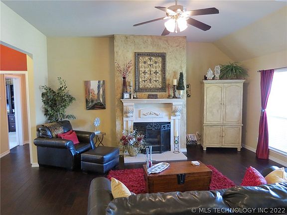 This open concept Bixby home features granite counter tops, SS Appliances, split bedroom plan, high ceilings, cast stone fire place, wood floors 2017, hot water tank 2017 & furnace 2016. Close to amenities and highways, fishing at our neighborhood pond.