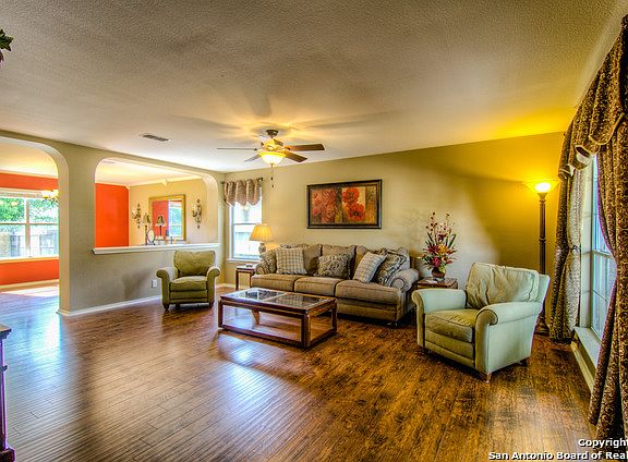 Cheerful home in a gated subdivision. Featuring large living room with hand scraped laminate floors, formal dining room, breakfast bar, eat in kitchen, fresh paint, custom MB, WALK IN master closet, and game room. Brand NEW roof, new front windows, new back fence. Move in ready. Close to shopping, dining, and entertainment. Easy access to 1604 / UTSA / USAA / MED CNTR. Won't last long, SEE NOW!