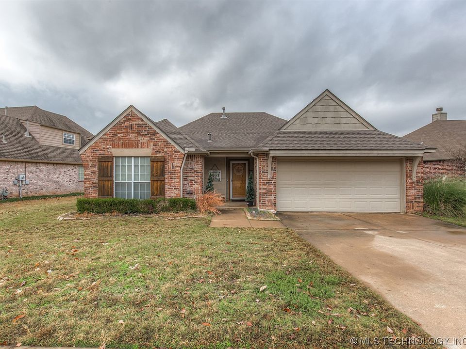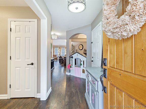 Jenks schools! Split bedroom floor plan! 3 bedrooms, 2 full baths, and a 2 car garage. Real hardwood floors through entire home including all bedrooms, stacked 4inch baseboards throughout, tray ceiling formal dining room, kitchen has granite counters and stainless steel appliances including updated oven, formal dining room and breakfast nook, secluded primary suite with tray ceiling, walk-in closet, dual vanity, full-tile shower and separate tub, soaring high ceilings in living room with gas fireplace, covered front porch, big bac patio, full privacy fenced backyard, neighborhood trails and basketball court, and swing set that stays with the property. Offer deadline: Sept 21st at 8:00 p.m.