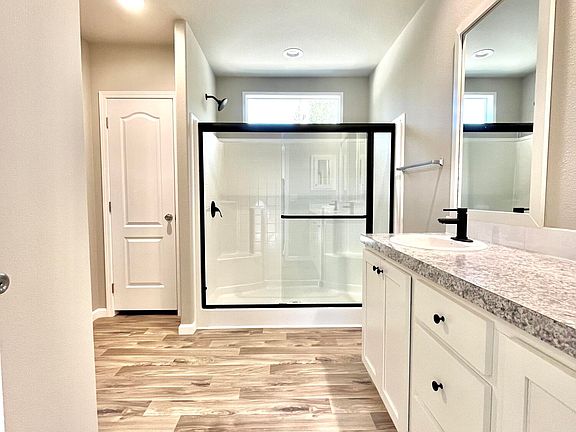 - Breakfast Bar, Ceiling Fan(s), Double Vanity, Fiberglass Stall Shower, Kitchen Island, Linen Closet, Open Floorplan, Pantry, Primary Downstairs, Shower/Tub Combo, Vaulted Ceiling(s), Walk-In Closet(s)