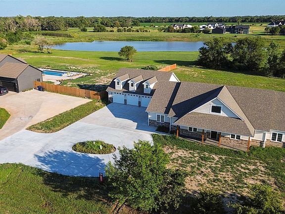 This sprawling home merges the luxury of new construction with the timeless feel of country living. It retains one of the largest lots in the Cherese Woods neighborhood, sitting on a 3.1 acre home site. Strategically located near K-42 and Maize Road, the home resides in the desirable Goddard School District with effortless access to several private schools as well. The home boasts 5 bedrooms and 3.5 bathrooms on 2706 square feet of slab-on-grade new construction. Enjoy the entry foyer, which boasts a 22 foot tall vaulted ceiling with an elegant chandelier. Continue on to the Great Room, complete with a coffered ceiling and gas fireplace flanked on both sides by 6 foot windows to expose the lake views beyond. A turn to the left will reveal an expansive kitchen with custom cabinetry from floor to ceiling, and a 10 foot island with a myriad of seating to enjoy company and socialize. This home is built to entertain-the formal dining room is exceptionally designed to accommodate extended family gatherings for the holidays. Joined to the main body of the home by a breezeway, the semi-detached 6 car, 1600 square foot garage houses an additional 700 square feet of potential finished space in the in-law suite above. The loft houses 3 dormers with windows to allow the warmth of natural lighting to illuminate the space within. Call now to reserve your viewing.