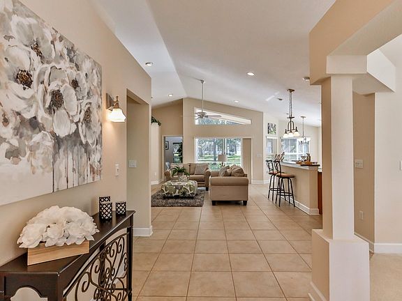 Beautiful maintained property located in upscale 55plus community. Open floor plan great for entertaining. Formal and informal living, 3 bedroom, 2 bath, 2 car garage. 42in Spiced Maple Cabinets, Stainless Steel, Corian. Spacious master bedroom and bath, Garden tub, walk in shower, walk in closet, linen closet, dual sinks. Two guest bedrooms and full guest bath. Upgraded cabinets, tile, custom entertainment/display. Laundry with sink and cabinets. Enjoy dining at the Wellington's Bar & Grill, lounging at the pool w/friends & neighbors, tennis, billiards, working out at the fitness center, or clubs, classes, and social events. Easy access to Gulf, Orlando, and Tampa (45 minutes to Tampa Intl). An awesome place to live.