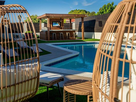 Sparkling poolModern light fixturesTwo-car garageMatte-black hardwareResort-style backyardUpgraded ensuite bathWine fridge